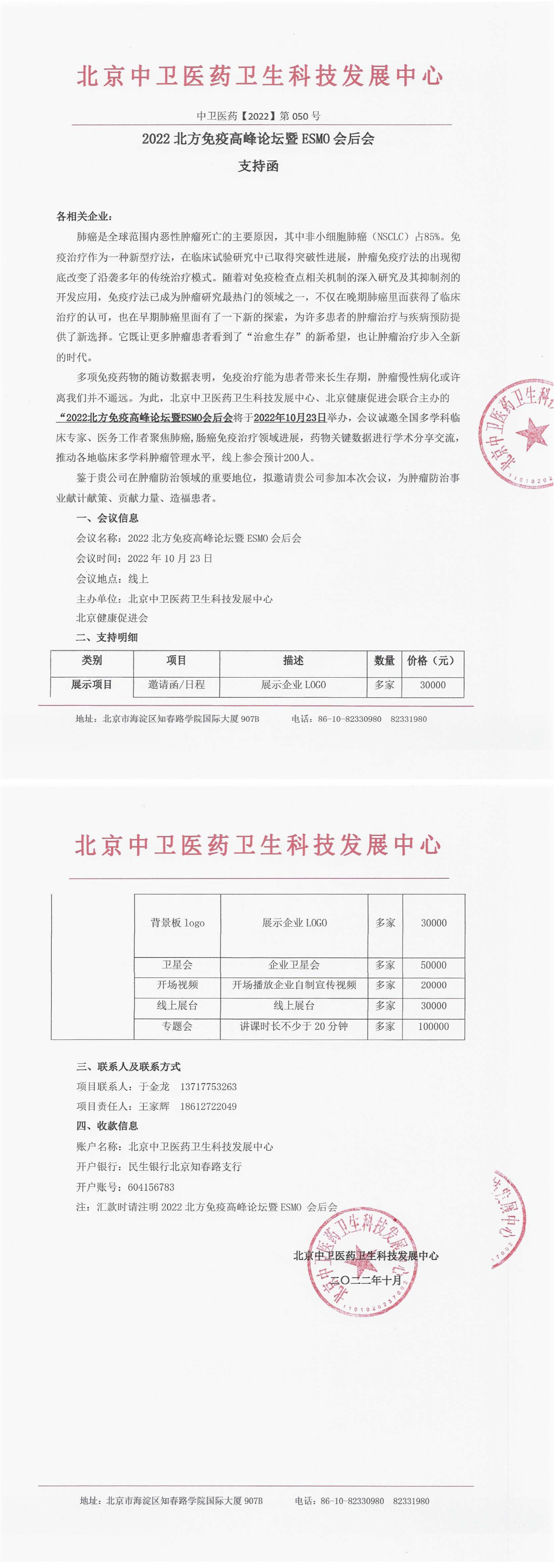 | 2022北方免疫高峰论坛暨ESMO会后会 支持函 | |||||